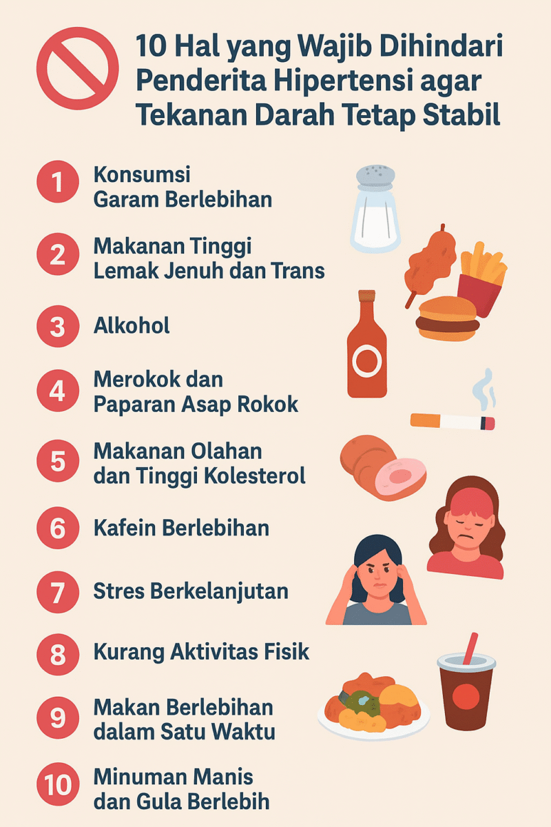 Mengendalikan hipertensi membutuhkan kedisiplinan dalam menjaga pola makan dan gaya hidup. Dengan menghindari garam berlebih, lemak jenuh, kafein, alkohol, stres, dan makanan olahan, tekanan darah lebih mudah dijaga tetap stabil. Pola hidup sehat, olahraga rutin, serta kepatuhan pada obat dari dokter merupakan kombinasi terbaik untuk mencegah komplikasi hipertensi.