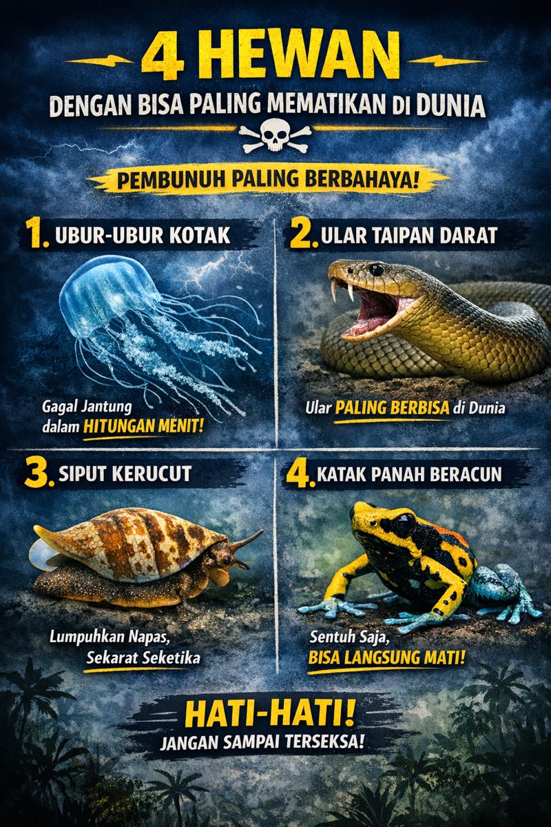 Banyak hewan di dunia memiliki racun sebagai mekanisme pertahanan maupun untuk melumpuhkan mangsa. Namun, beberapa di antaranya dikenal memiliki bisa yang sangat mematikan dan mampu menyebabkan kematian dalam waktu singkat. Berikut empat hewan dengan bisa paling mematikan di dunia.