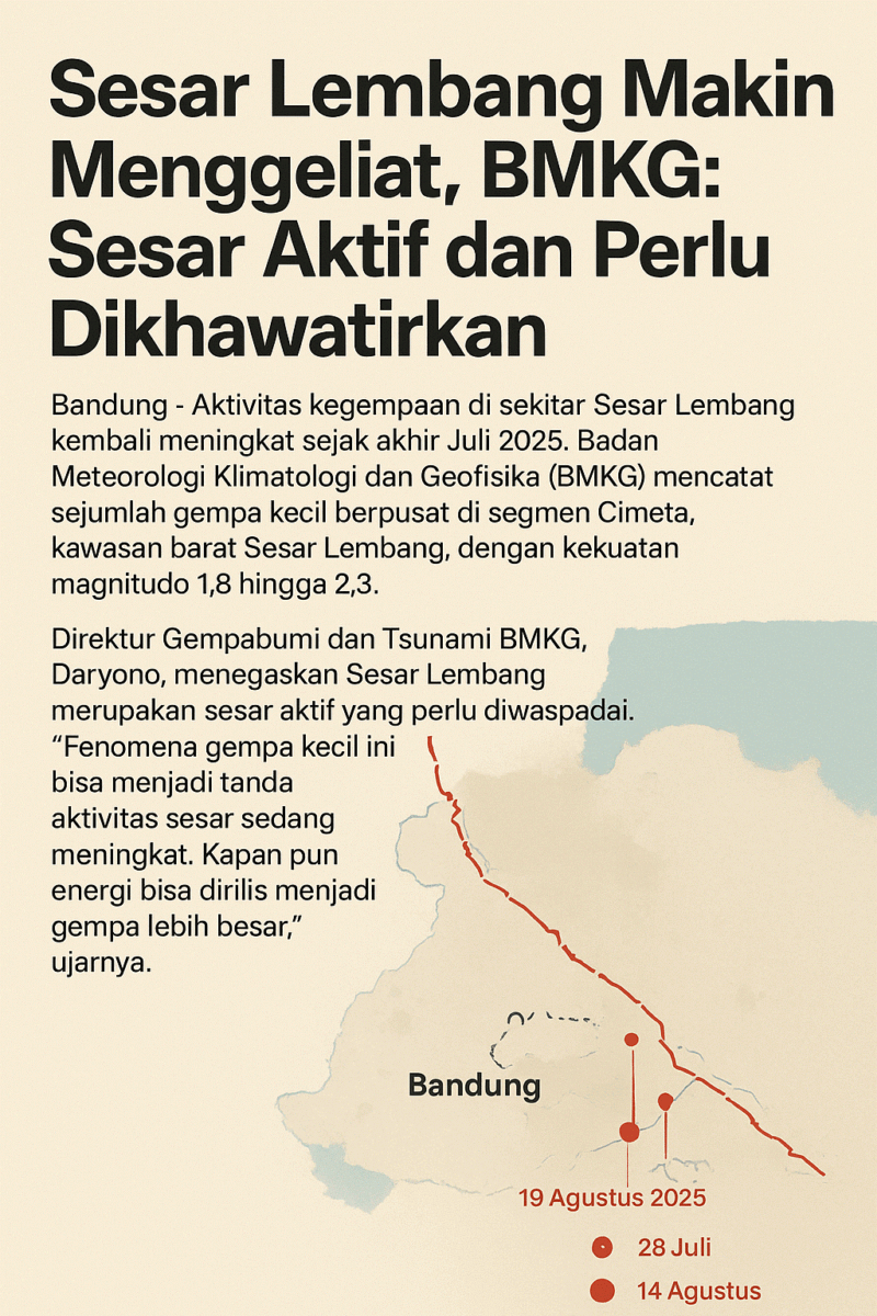 Bandung – Aktivitas kegempaan di sekitar Sesar Lembang kembali meningkat sejak akhir Juli 2025. Badan Meteorologi Klimatologi dan Geofisika (BMKG) mencatat sejumlah gempa kecil berpusat di segmen Cimeta, kawasan barat Sesar Lembang, dengan kekuatan magnitudo 1,8 hingga 2,3.