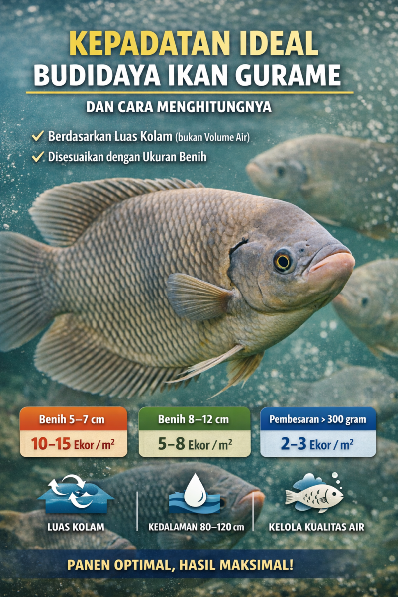 Untuk budidaya gurame konsumsi dengan target bobot di atas 300 gram per ekor, terutama di kolam tanah tanpa aerator, praktisi perikanan merekomendasikan kepadatan 2–3 ekor per meter persegi. Kepadatan ini dinilai lebih realistis dan aman karena memberikan ruang gerak cukup bagi ikan, menekan tingkat stres, serta menjaga kualitas air tetap stabil.