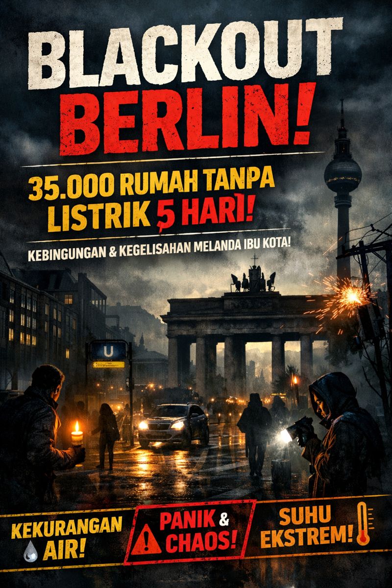 Pemadaman listrik besar‑besaran mengguncang Berlin sejak Sabtu pagi (3 Januari 2026). Sekitar 35.000 rumah diperkirakan akan tetap tanpa listrik hingga lima hari ke depan, setelah kebakaran pada kabel tegangan tinggi di kawasan Lichterfelde merusak jaringan utama pasokan listrik. Kejadian ini kini diselidiki sebagai dugaan pembakaran (arson).