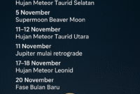 Sepanjang bulan November 2025, langit malam Indonesia akan dihiasi berbagai fenomena astronomi menarik. Mulai dari Supermoon Beaver Moon hingga hujan meteor Leonid, sejumlah peristiwa…