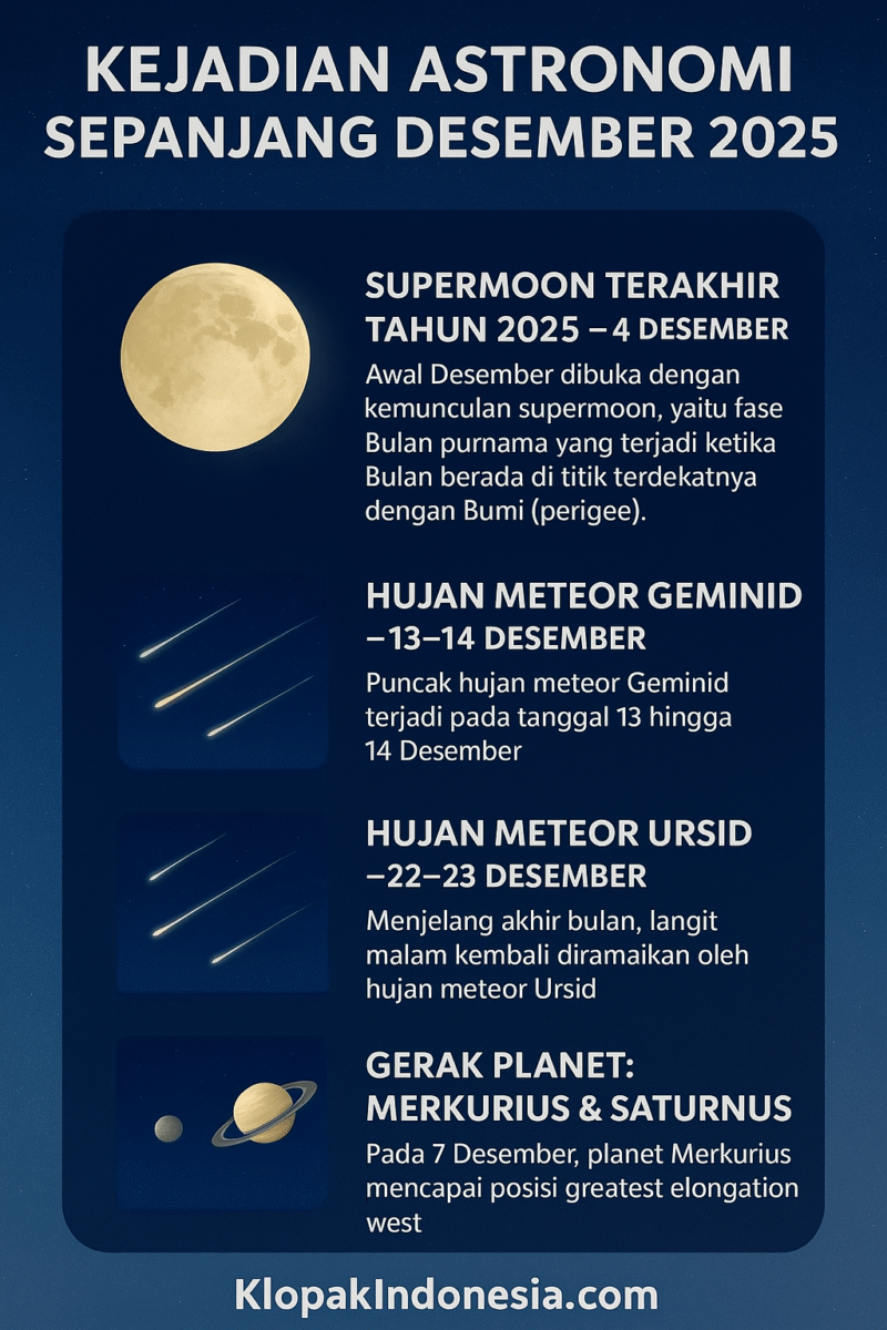 Desember 2025 menjadi salah satu bulan yang paling ramai dengan fenomena langit. Mulai dari supermoon terakhir tahun ini, dua hujan meteor yang selalu dinanti, hingga peristiwa solstis yang menandai perubahan musim. Berikut rangkuman lengkap yang telah disusun oleh redaksi KlopakIndonesia.com untuk membantu pembaca menikmati berbagai momen terbaik di langit malam Indonesia.