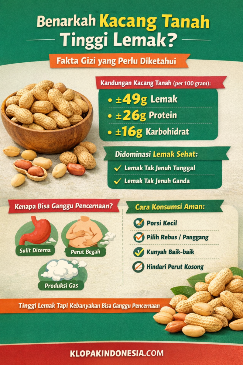 Kacang tanah memang tinggi lemak, namun mayoritas adalah lemak sehat yang bermanfaat bagi tubuh. Meski demikian, konsumsi berlebihan atau cara pengolahan yang kurang tepat dapat memicu rasa tidak nyaman pada pencernaan. Dengan porsi dan pengolahan yang benar, kacang tanah tetap menjadi pilihan makanan bergizi dan aman dikonsumsi.