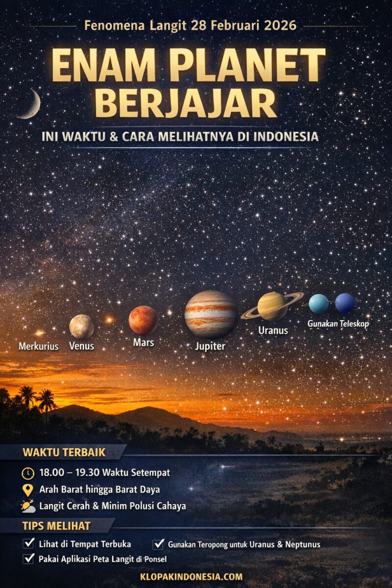 KLOPAKINDONESIA.COM – Fenomena langit langka kembali menyapa masyarakat Indonesia. Pada Jumat, 28 Februari 2026, enam planet di Tata Surya tampak “berjajar” di langit saat senja hingga awal malam. Peristiwa astronomi ini dikenal sebagai planetary alignment atau parade planet.