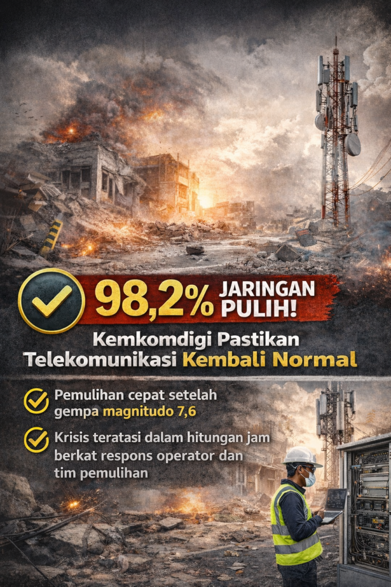 Klopakindonesia.com – Kementerian Komunikasi dan Digital (Kemkomdigi) memastikan layanan telekomunikasi di Sulawesi Utara tetap terjaga dan berhasil dipulihkan dengan cepat setelah gempa bumi bermagnitudo 7,6 yang terjadi pada Kamis (02/04/2026) pukul 05.48 WIB.