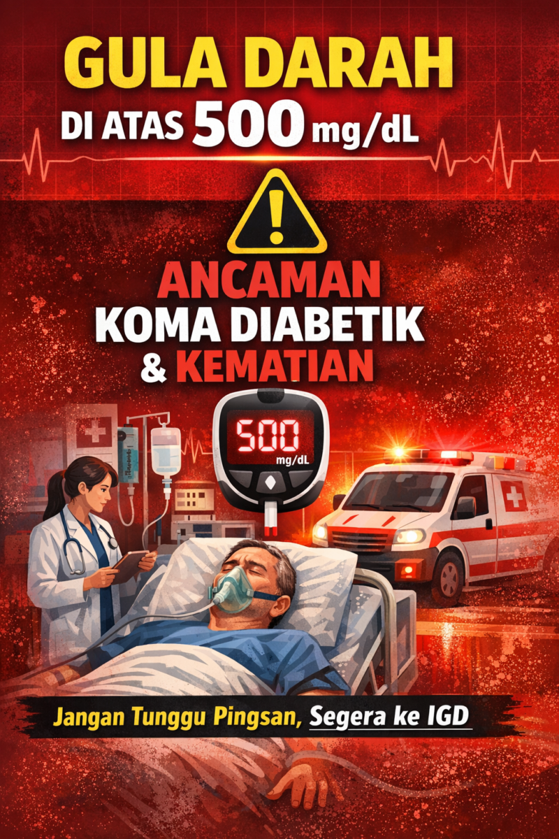 Gula darah di atas 500 mg/dL bukan kondisi normal, melainkan sinyal bahaya serius yang dapat memicu koma diabetik dan mengancam nyawa. Kesadaran akan risiko, deteksi dini, serta respons cepat sangat menentukan keselamatan penderita diabetes.