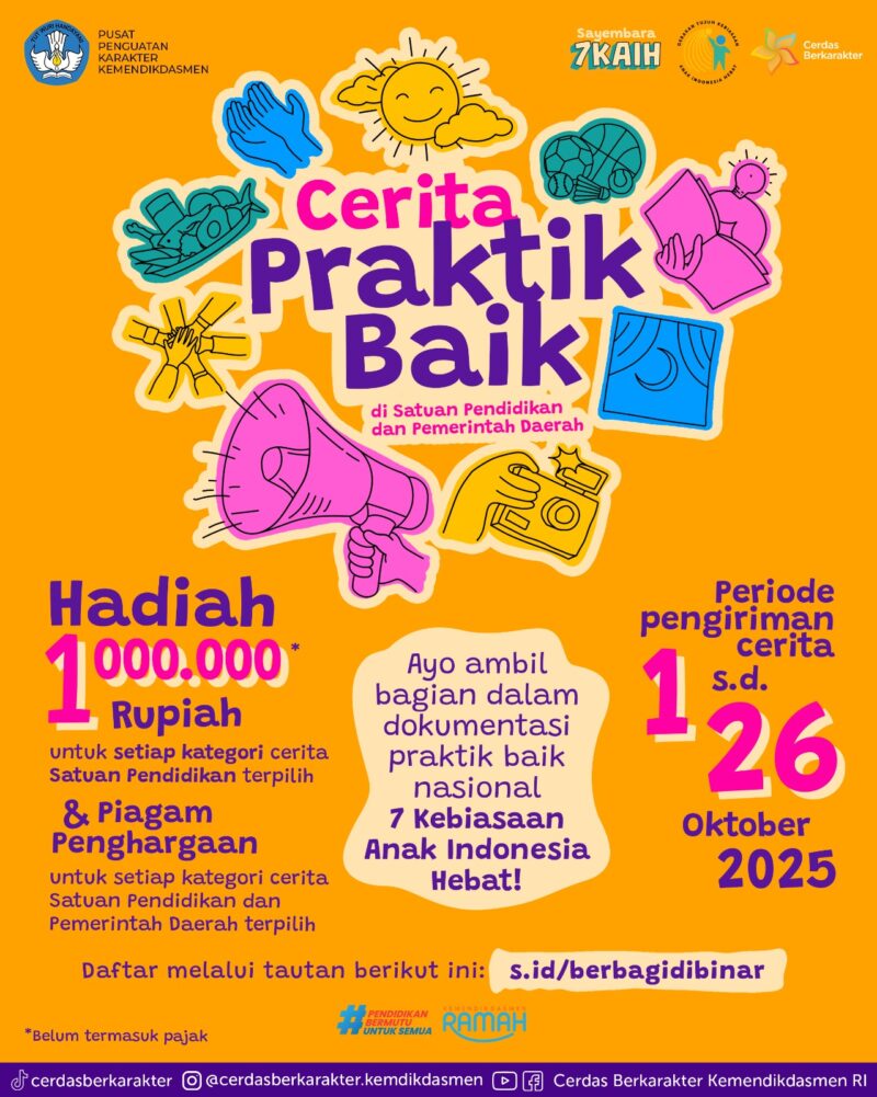 KlopakIndonesia – Kementerian Pendidikan Dasar dan Menengah (Kemendikdasmen) melalui Pusat Penguatan Karakter (Puspeka) mendorong semangat berbagi praktik baik dari daerah, sekolah, dan murid di seluruh Indonesia melalui Sayembara 7 Kebiasaan Anak Indonesia Hebat (7 KAIH). Sayembara yang telah berlangsung sejak 1 hingga 26 Oktober 2025 ini merupakan langkah konkret untuk memperkuat pelaksanaan Gerakan 7 KAIH, program prioritas Kemendikdasmen yang bertujuan menumbuhkan karakter unggul generasi muda menuju Indonesia Emas 2045.