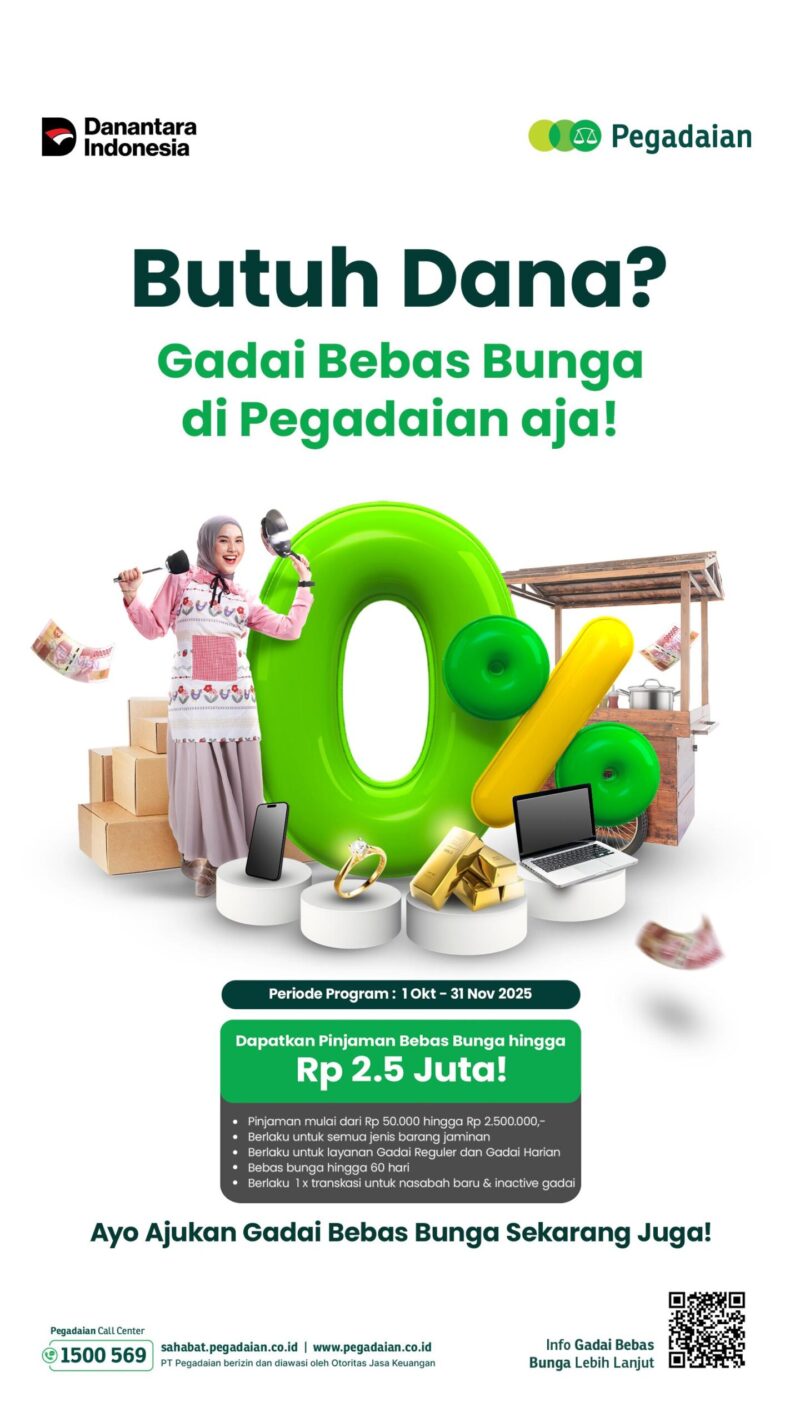 PT Pegadaian kembali menghadirkan program Gadai Bebas Bunga yang berlaku mulai 1 Oktober hingga 31 November 2025. Program ini memberikan kesempatan bagi masyarakat untuk mendapatkan pinjaman mulai dari Rp 500.000 hingga Rp 2.500.000 tanpa dikenakan bunga hingga 60 hari.
