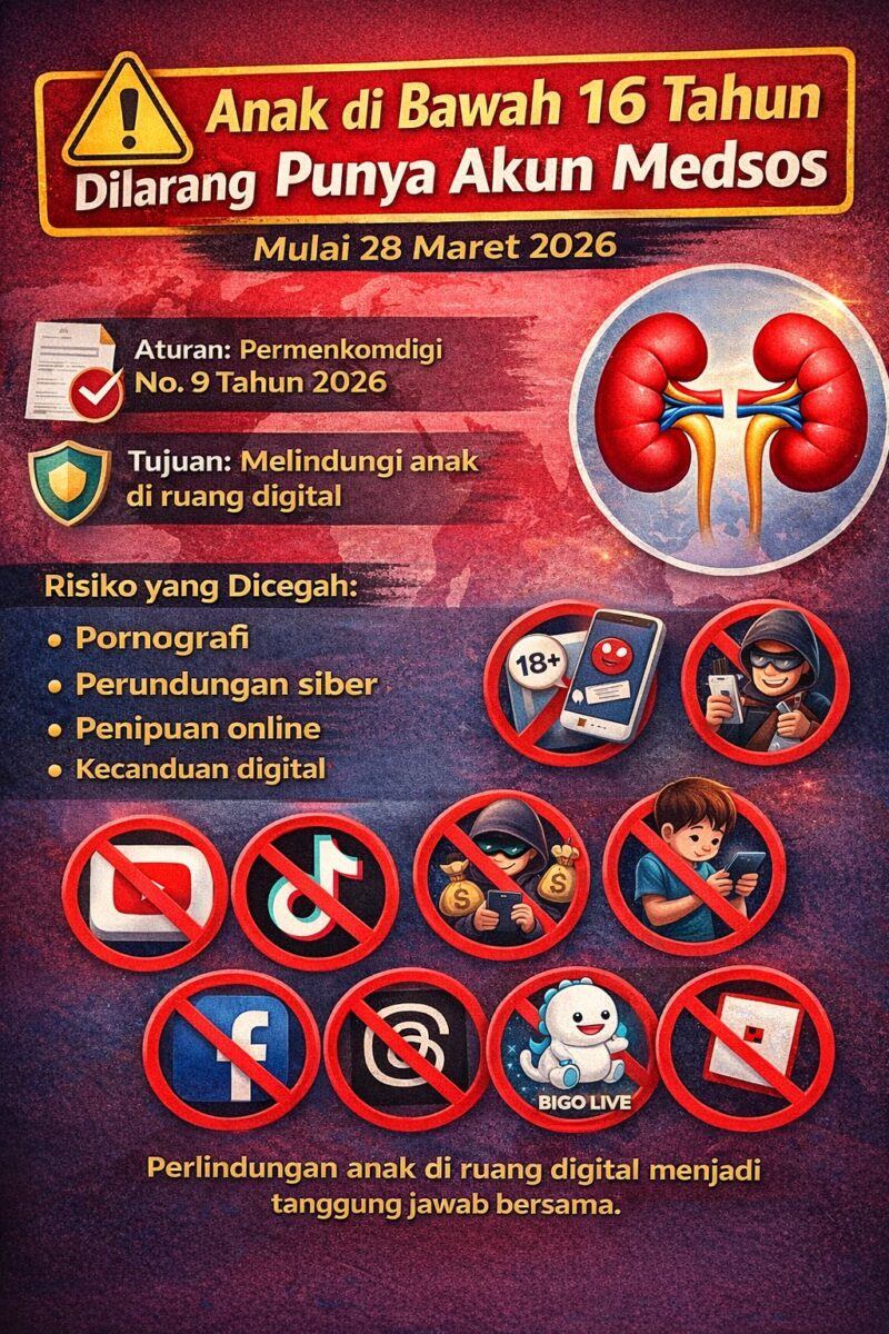 Pemerintah akan mulai membatasi akses media sosial bagi anak-anak berusia di bawah 16 tahun mulai 28 Maret 2026. Kebijakan ini tertuang dalam Peraturan Menteri Komunikasi dan Digital (Permenkomdigi) Nomor 9 Tahun 2026 sebagai upaya melindungi anak dari berbagai risiko di ruang digital.
