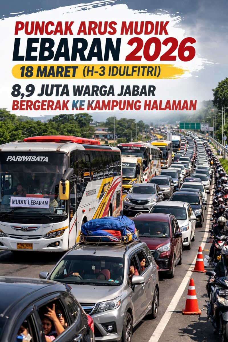 BANDUNG — Puncak arus mudik Lebaran 2026 diperkirakan terjadi pada H-3 Idulfitri atau Rabu, 18 Maret 2026. Pada waktu tersebut diprediksi sekitar 8,9 juta warga Jawa Barat melakukan perjalanan mudik.